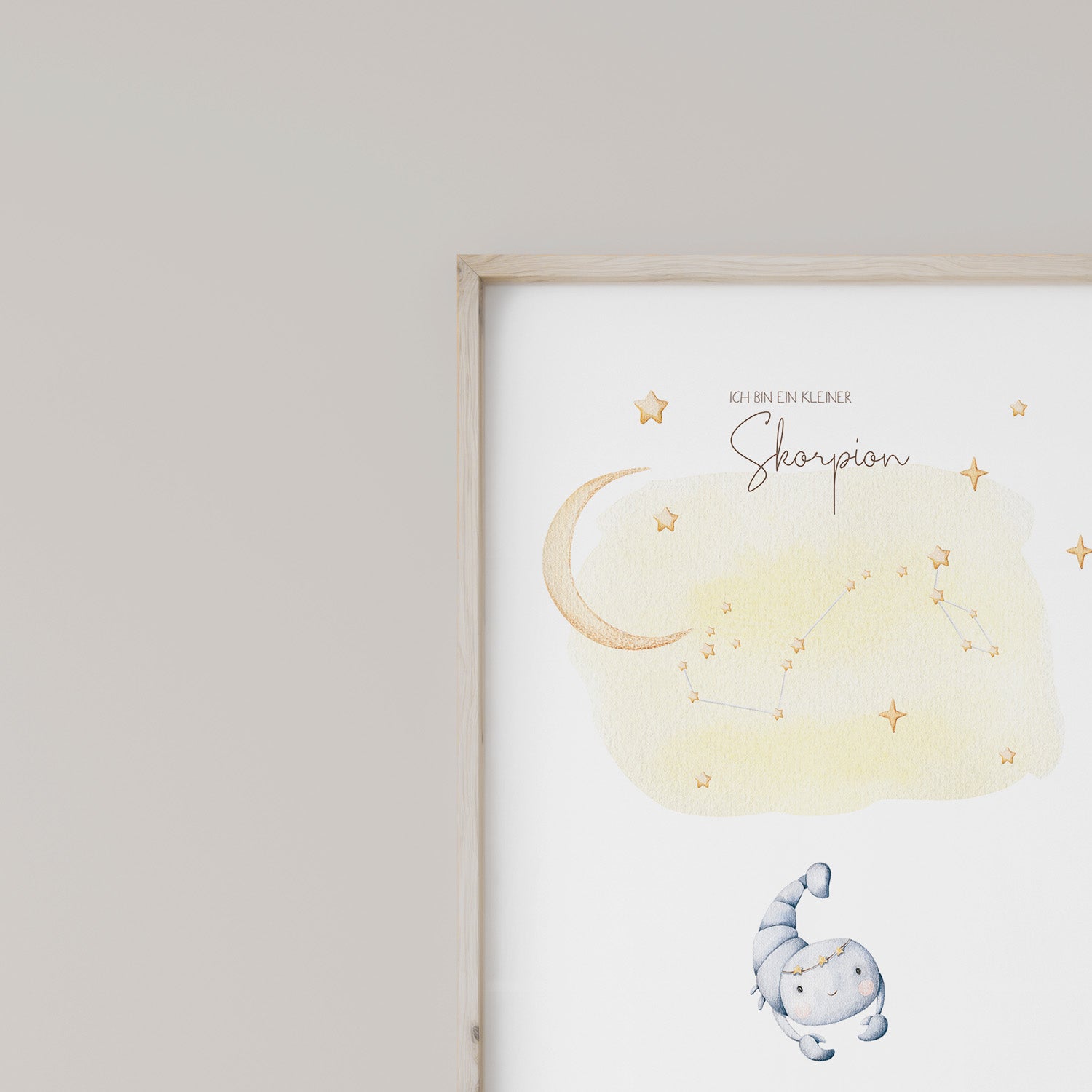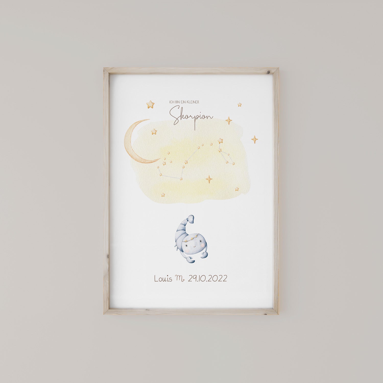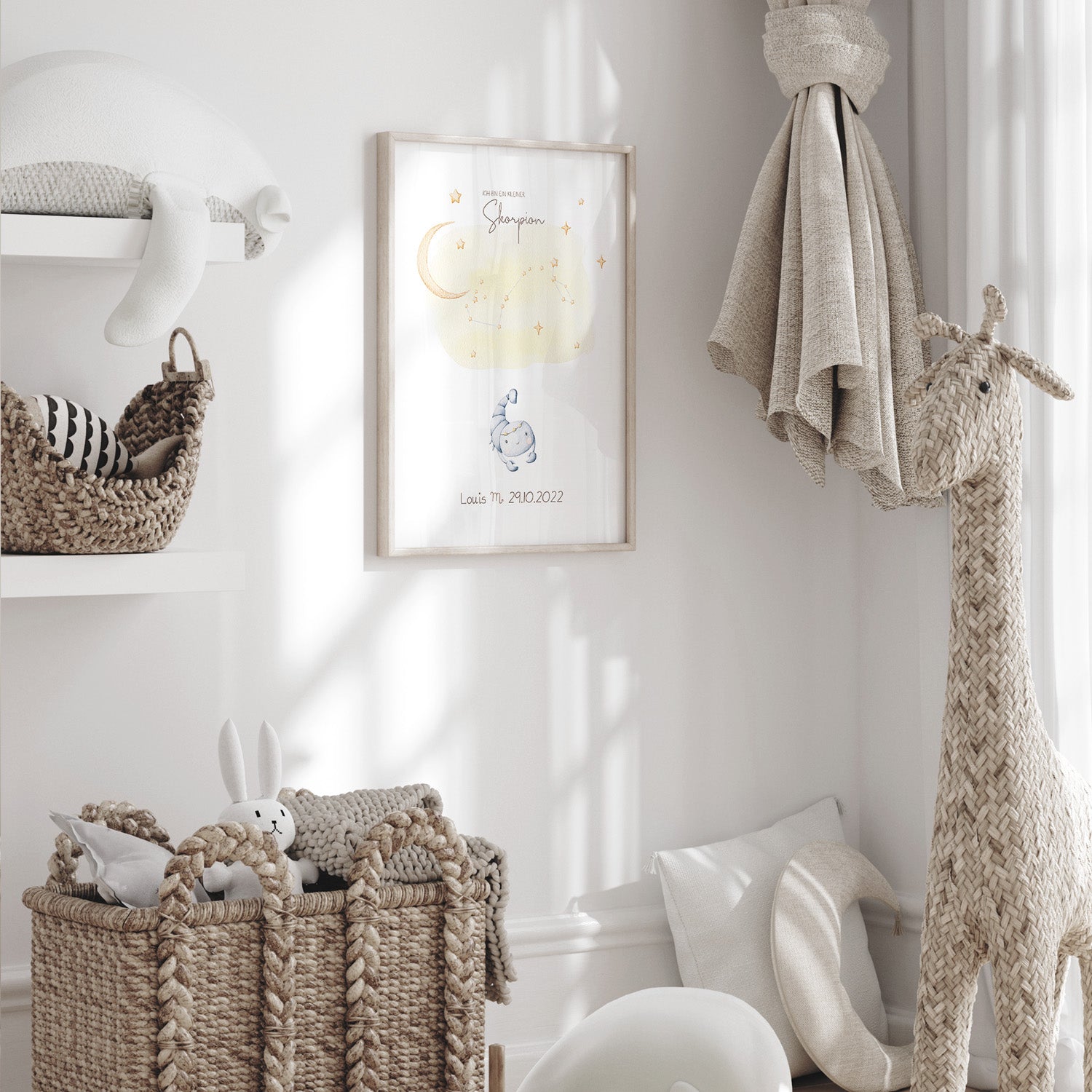 Ein personalisierbares Wandbild mit Sternzeichen für das Kinderzimmer deines Babys oder als Geschenk für einen neuen Weltbewohner. Eine tolle Idee, um die Umgebung deines Lieblings individuell und besonders zu gestalten. Es ist nicht nur wunderschön, sondern auch eine liebevolle Erinnerung an den besonderen Tag der Geburt.
