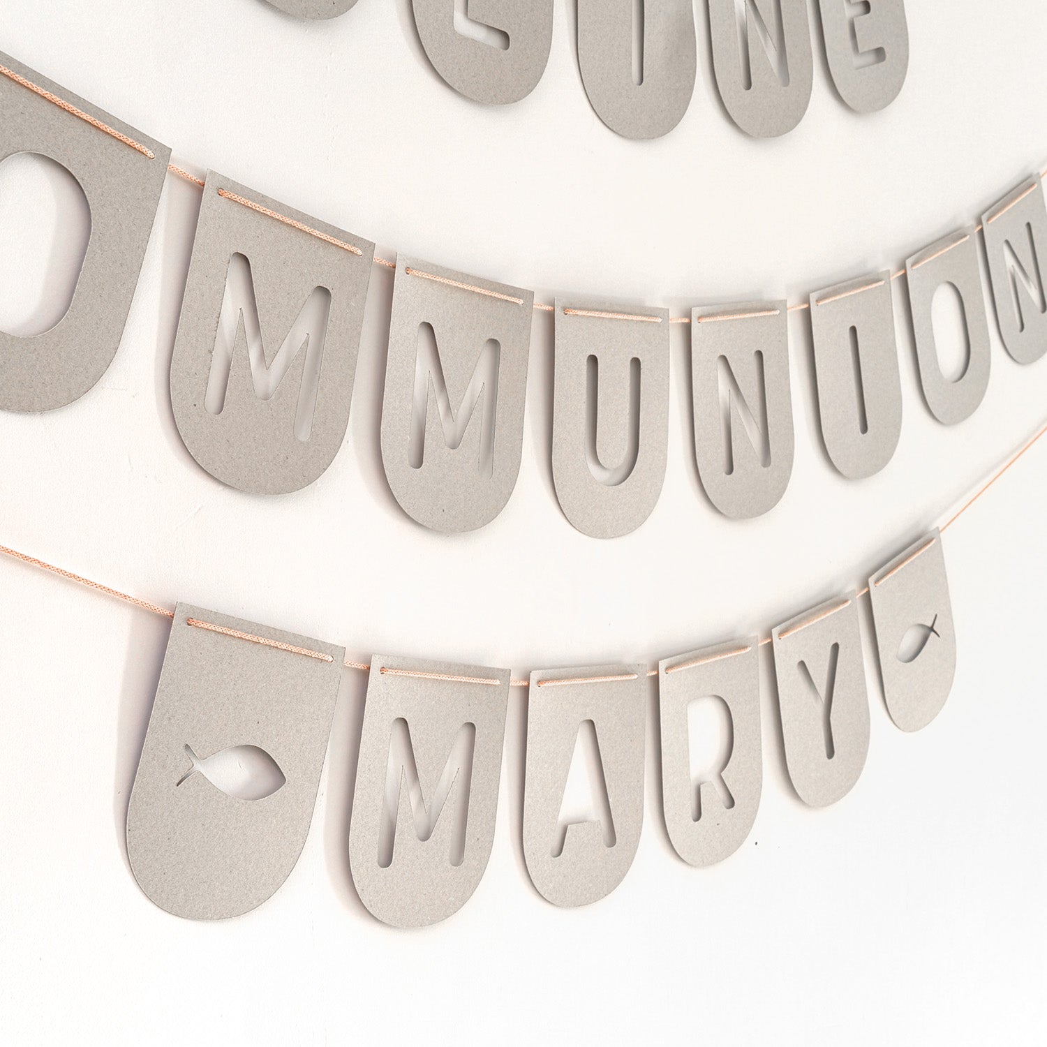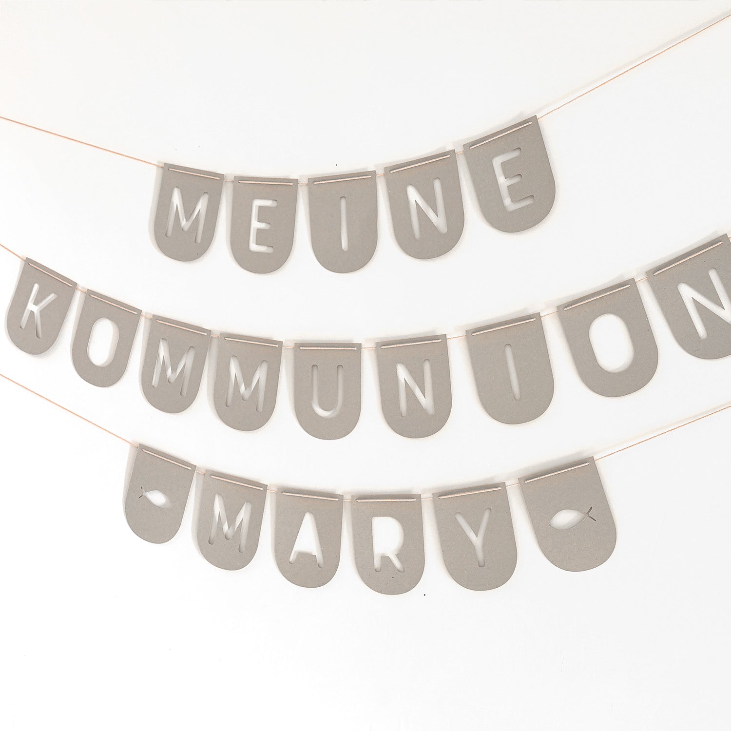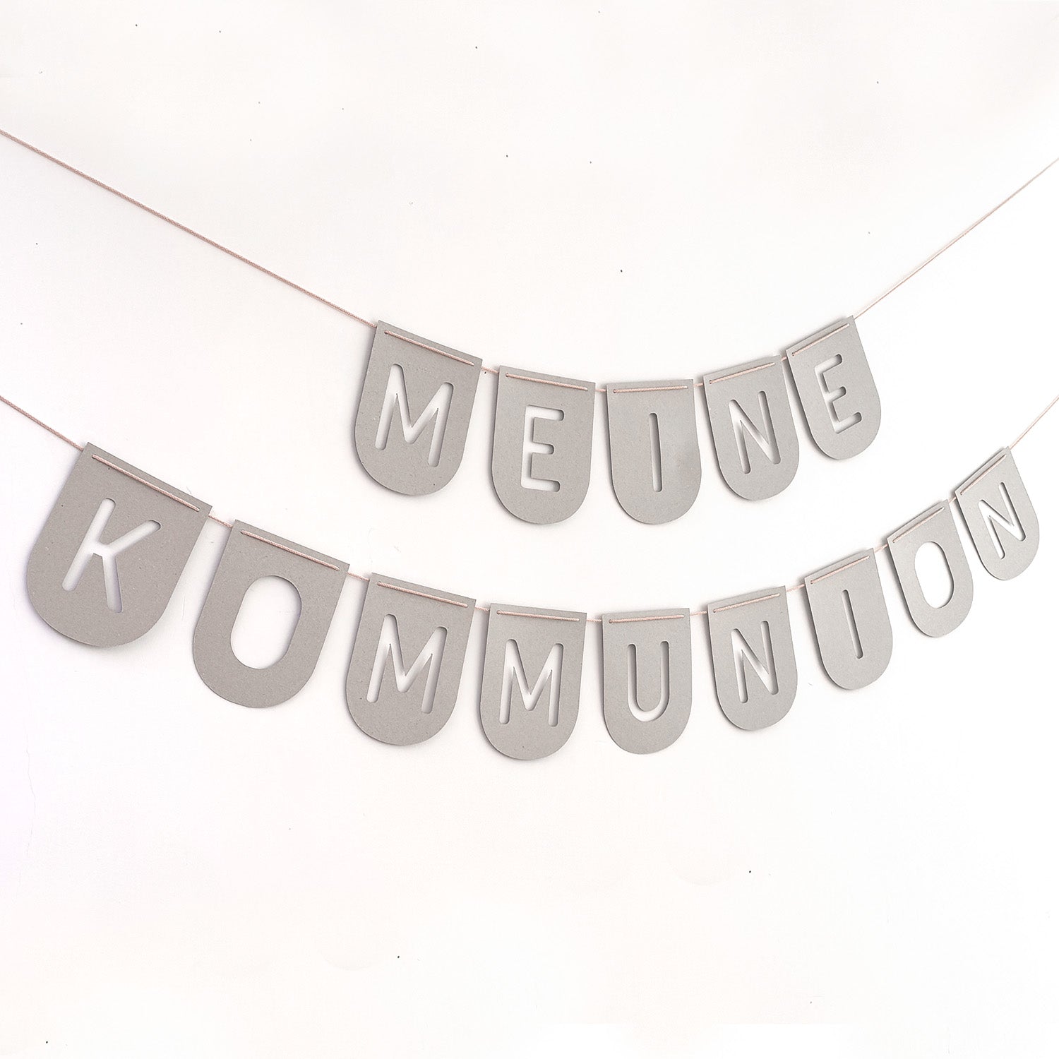 Eine wunderschöne personalisierbare Girlande aus hochwertigen recycelten Materialien - Meine Kommunion - eine nachhaltige und natürliche Dekoration für deine Kommunionsfeier.